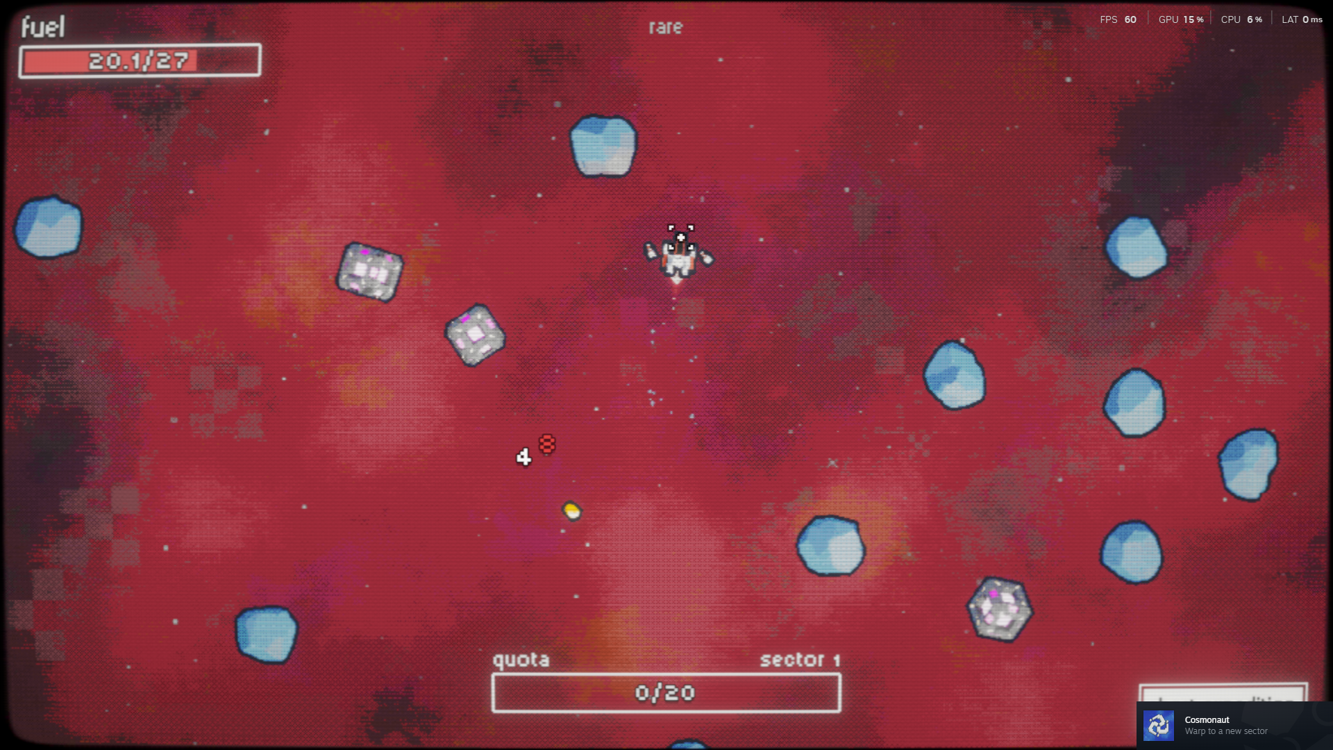 The main gameplay loop revolves around breaking rocks with your space ship. It has a lot in common with games like Vampire Survivors, as your ship will target the nearest asteroid and shoot it until it blows up. You have to fly close to the mined resource to pick it up and your run will end when you run out of fuel or into an asteroid. As you unlock parts of the skill tree, your fuel reserves will grow, weapon output will increase and your time in each expedition will last longer, resulting in more returned rocks, more money and more unlocked skills. As you unlock the hyperdrive, you open up levels which can range from common to legendary. The higher tier levels come with better materials but as you progress through stages, you’ll notice that your ship runs out of fuel quickly without the proper upgrades.