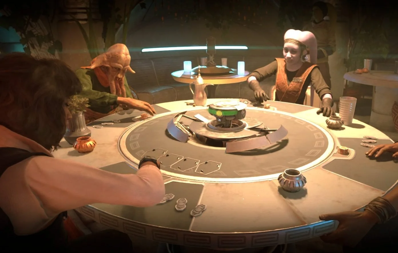 Finally there is the game of Sabacc. This is Star War’s poker game and you will find yourself at tables across the rim, seeking to be the winner at the table. Without a doubt this is one of the best parts of the game, and really encourages you to slow down and enjoy the ambiance of the game. The goal for this minigame is to get a matching pair of cards with 1s being the best and 6s the worst. You start with a number of chips to spend on getting new cards, if you win the round you get your chips back, if you lose you don’t get anything back. This encourages either a nova hand where you spend as much as possible to get the best hand, or a conservative play where you only buy cards if you have one amazing card to try and match to.